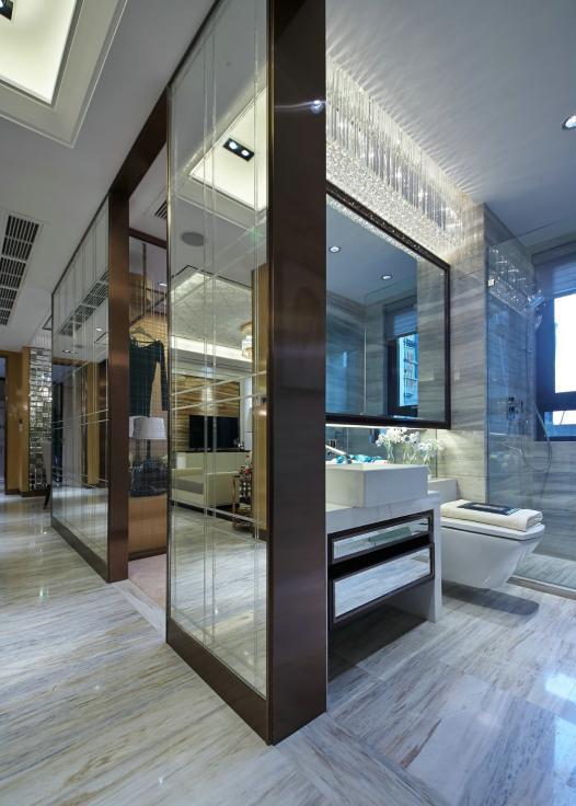 主卧室卫生间采用钢化玻璃与客厅隔离,弧线非常圆,浴缸柱设计,浴缸角放置镜子增加空间感,吊灯外观开放,非常有设计感。