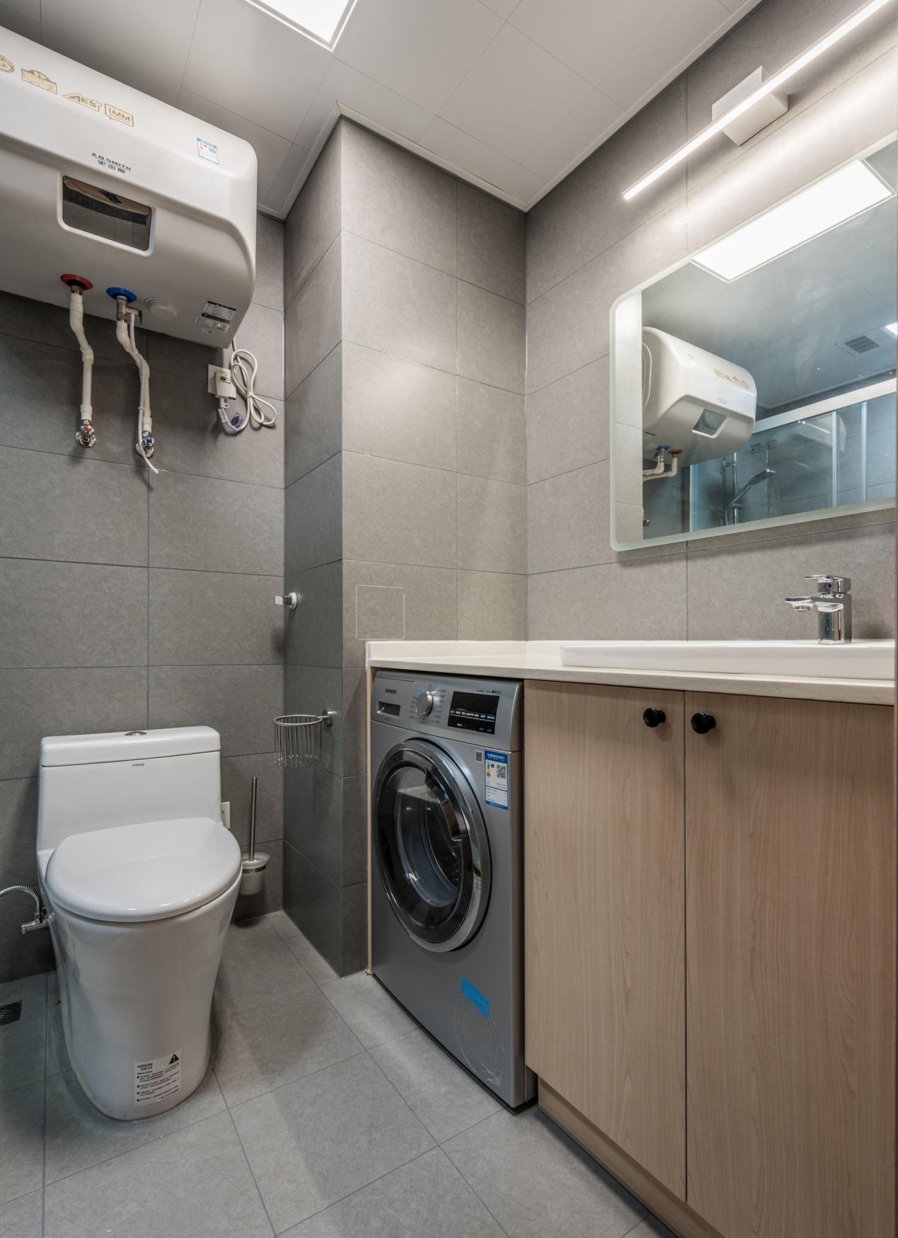 卫生间以先进的灰色为主色调,氛围简单,原木浴柜组合,集成滚筒洗衣机,提高空间利用率,方便实用。