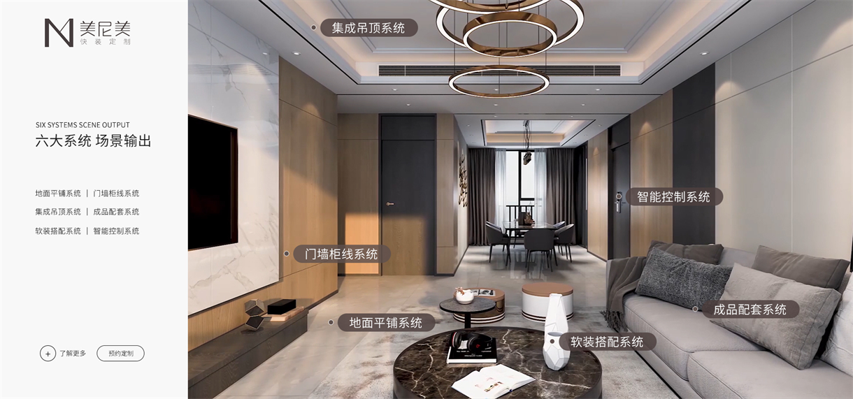 其次,基于快速设计+定制标准木作板件+现场制作安装的模式,美尼美快装定制研发并提供门墙柜线木作系统、地面平铺系统、集成吊顶系统、成品配套系统、软装搭配系统、智能控制系统等综合空间一体化系统化解决方案,5大风格,6大系统,10大空间产品,真正做到全案设计、装配式快装、整体空间交付,即装即住。