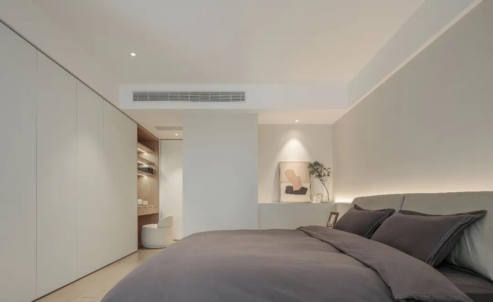 设计师除开整体颜色应用很多米色来加强温馨的气氛,还利用微水泥自然温和的纹路来提高空间的层次感。光源、样式、曲线,纹路、触感、颜色,全部的空间原材料,根据设计师融洽而充斥着韵律的结合,聚集出充斥着质感的极简风格。