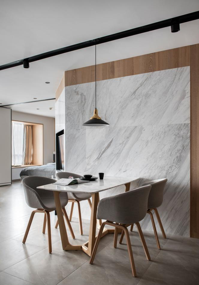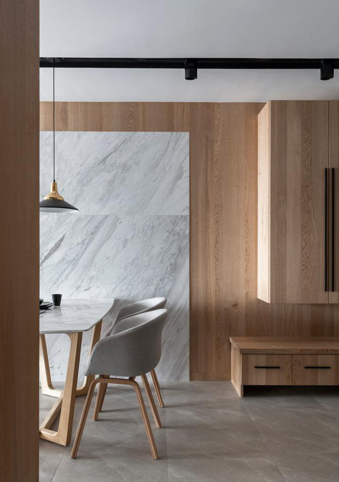 灰白相连的石材质感,与木材的温暖,传达出干净细腻的空间感。