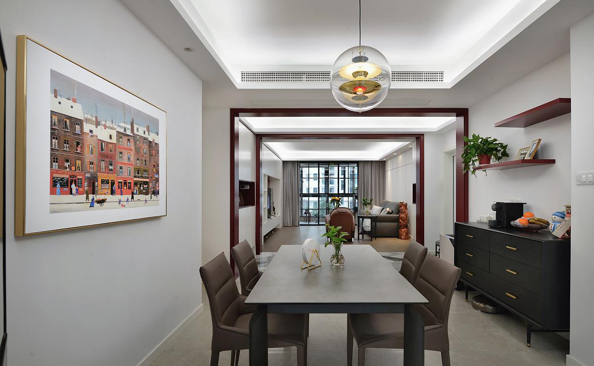 餐厅传承了全屋现代中式的风格,同时以白色墙面为主背景,灰黑色木材餐边柜中和了空间的冷淡感,让家现代简约温馨,再配搭深棕色坐椅,增加一丝复古时尚风采。