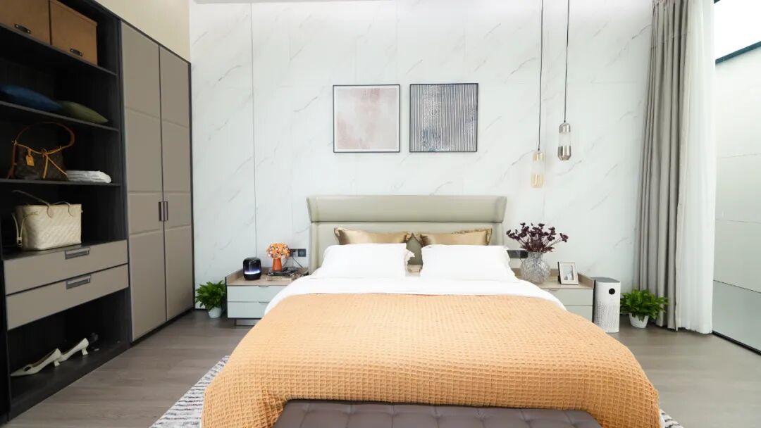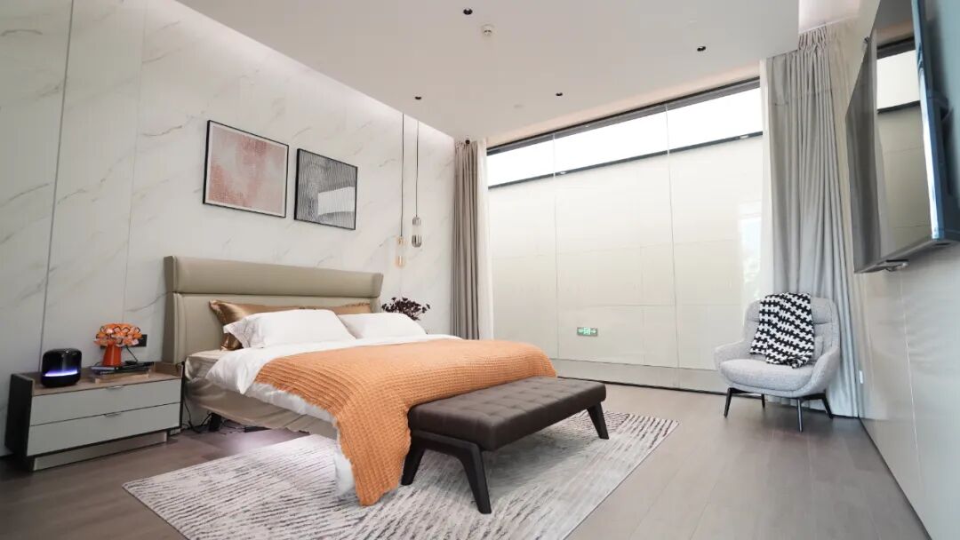卧室通过全场景产品自由联动,展现出未来家居生活的智慧体验,以人为本的设计,建立起了与用户更深层的情感共振。