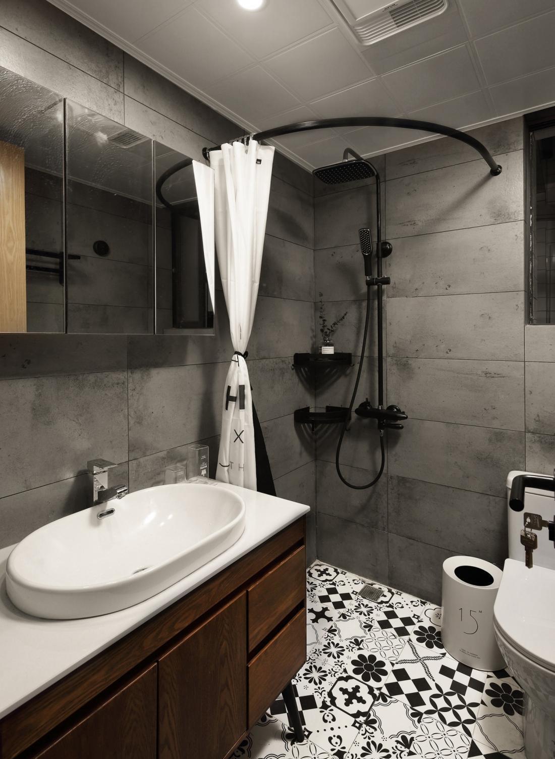 黑白印花瓷砖简单可爱,灰色墙面高档有趣。浴帘的选择不仅可以干湿分离,还可以保证空间的灵活性。不洗澡的时候不会减少使用空间,很方便。